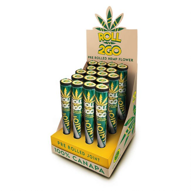 Il Box Espositore contiene 18 pre roll con porta cono sigillato in plastica. Vengono arrotolati usando cartine organiche a base di canapa naturale che mantengono l’infiorescenza all'interno. I Roll2Go eliminano il fastidio di macinare, arrotolare e sigillare. Le infiorescenze di canapa naturale sono elevatissima qualità, altamente selezionate, coltivate senza l'utilizzo di additivi chimici, privilegiando aromi intensi atte a renderle uno strumento gestuale e sensoriale di altissima qualità: il THC si mantiene sotto lo 0,5% mentre i valori di CBD superano il 10%.